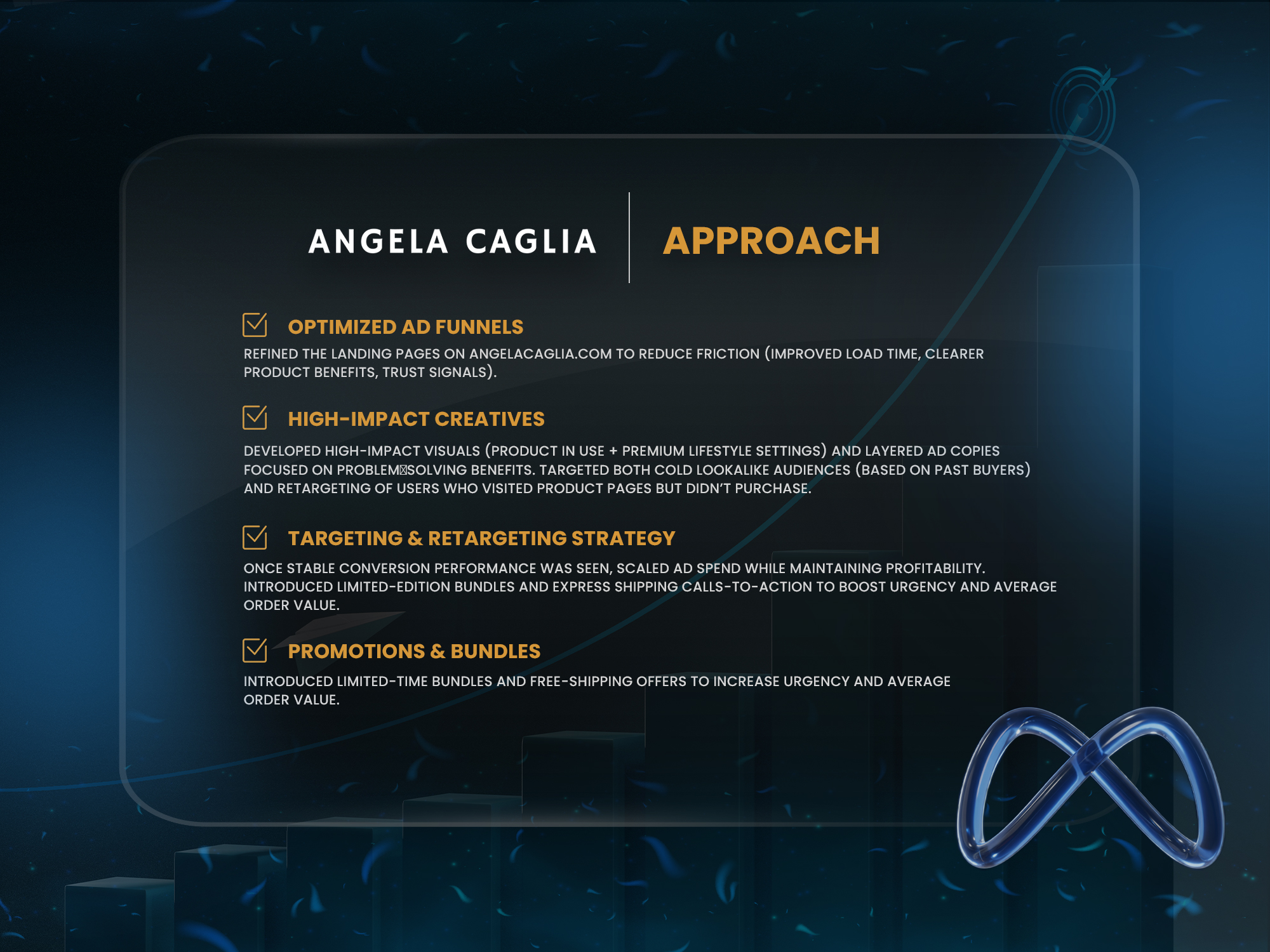 By optimising the funnel, using premium creatives, and applying precise targeting, I helped Angela Caglia achieve a strong ROAS and consistent ecommerce growth. This project showcases my ability to scale Meta Ads for luxury skincare brands and deliver measurable performance improvements.