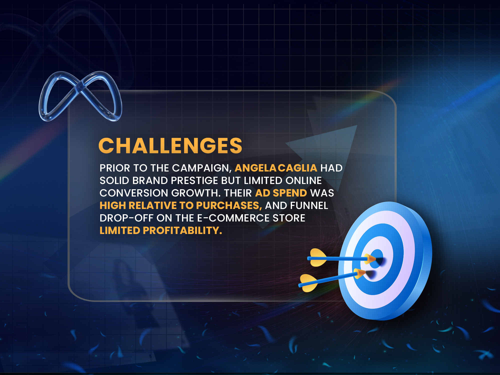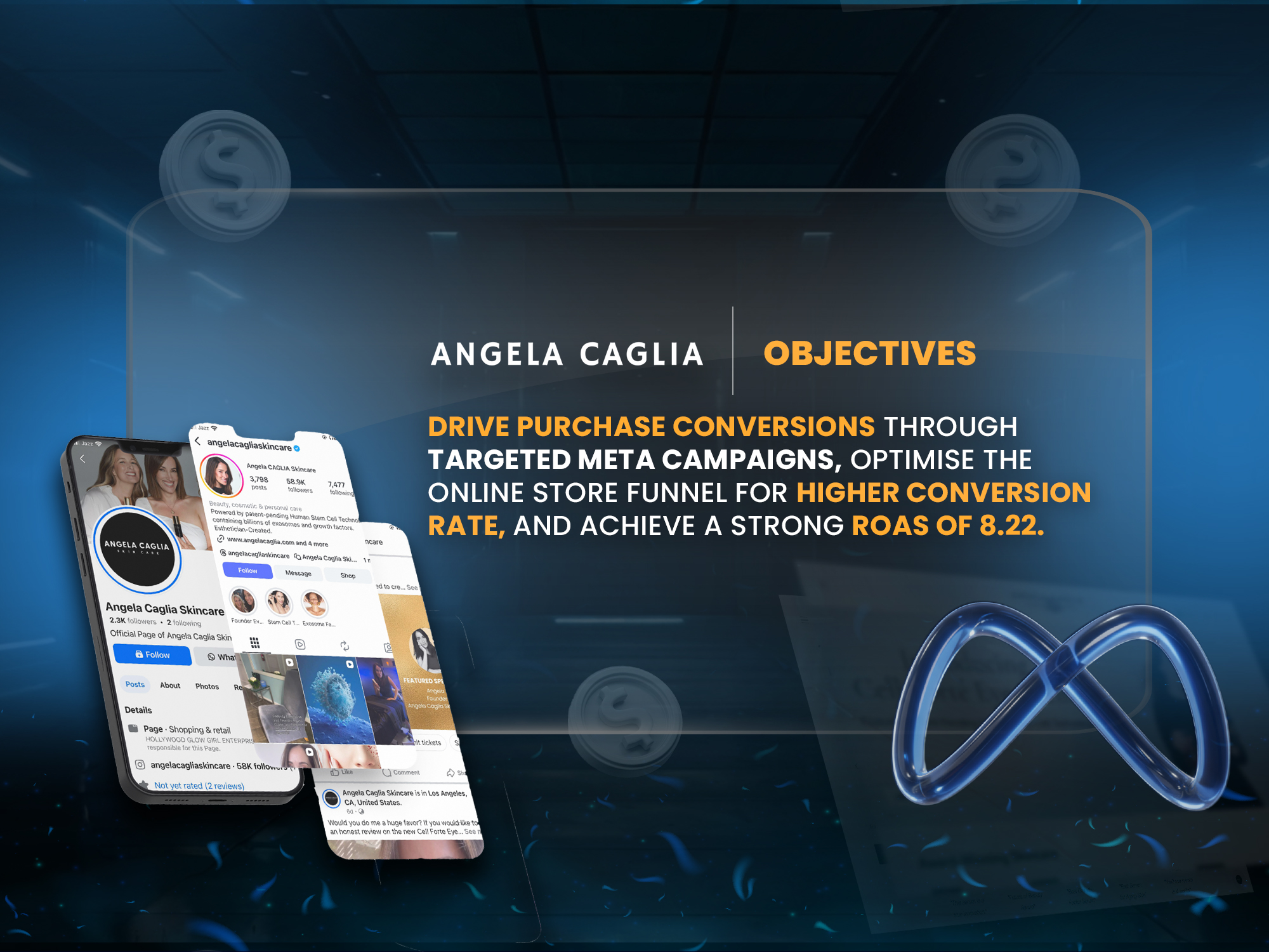 Angela Caglia is a high end skincare brand known for blending clinical science with luxury aesthetics. Although the brand had strong recognition, online conversion growth was slow. Their ad spend was high compared to purchases, and many users were dropping off before reaching checkout. They needed a fully optimized Meta Ads strategy to drive consistent sales at a profitable ROAS.