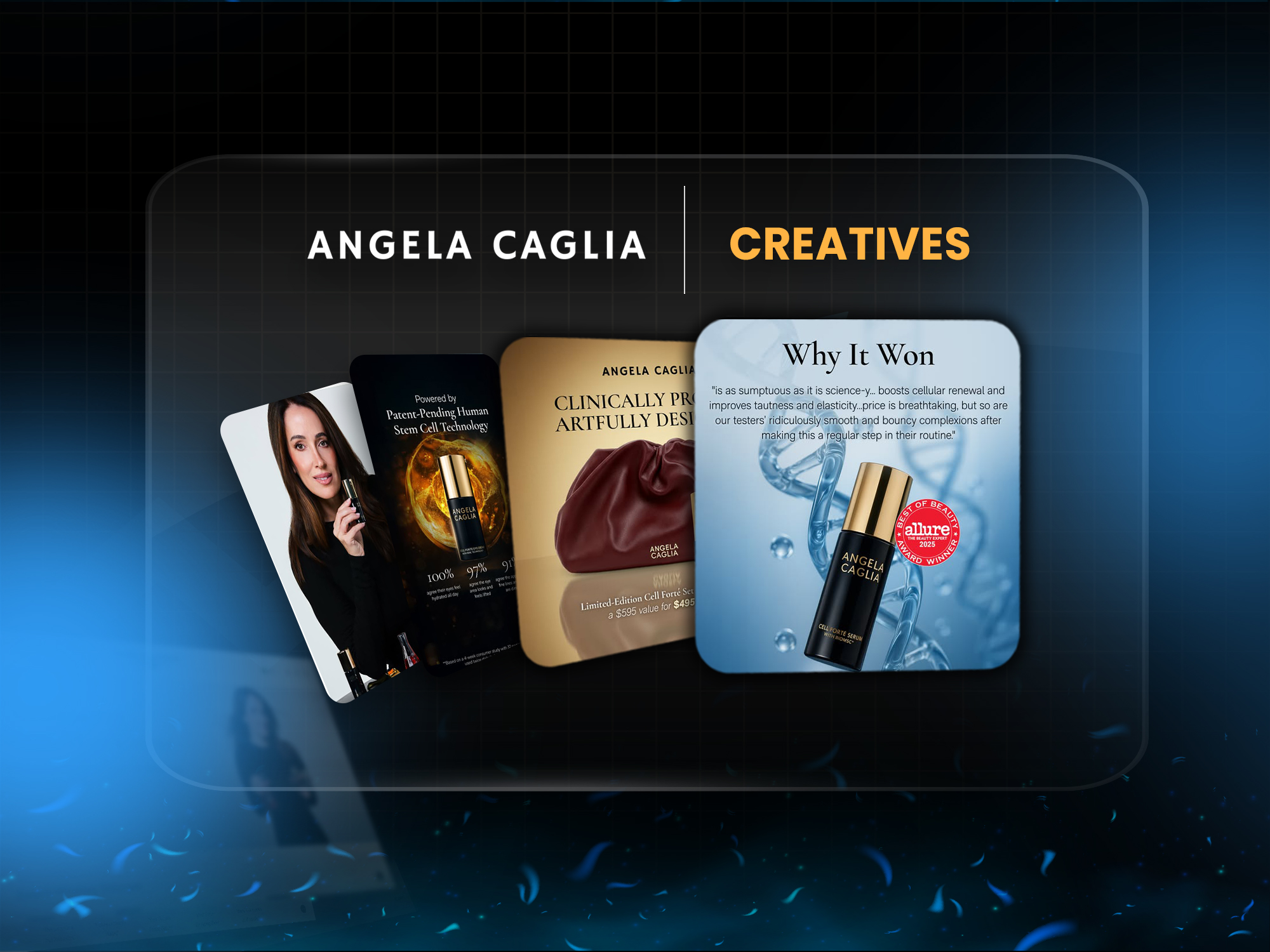 I tested multiple ad formats including videos, carousels, and premium lifestyle imagery. The focus was on real skincare results, texture shots, and a luxury feel that matched the brand identity.